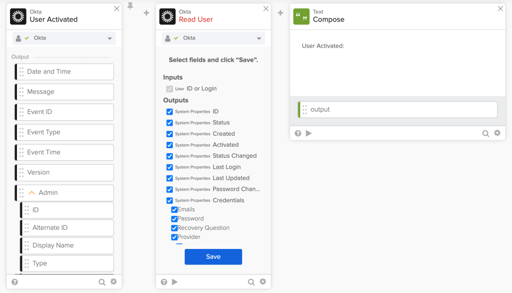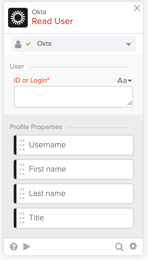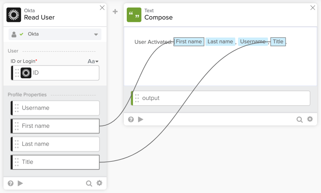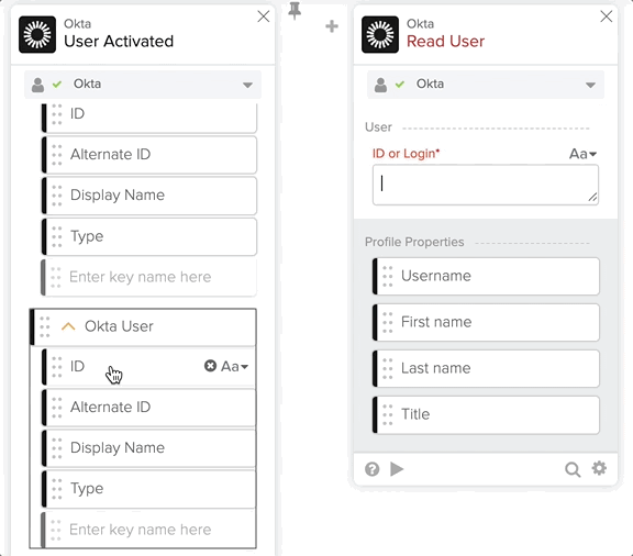 The Read User card requires an ID or Login. The User Activated event has the ID available under the Okta User field.