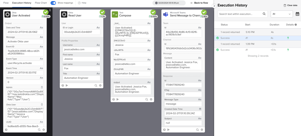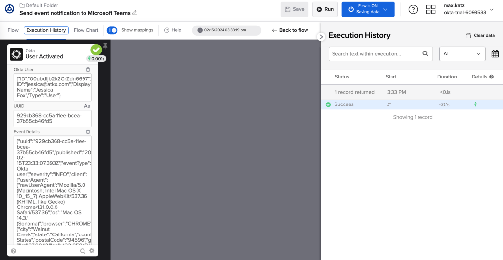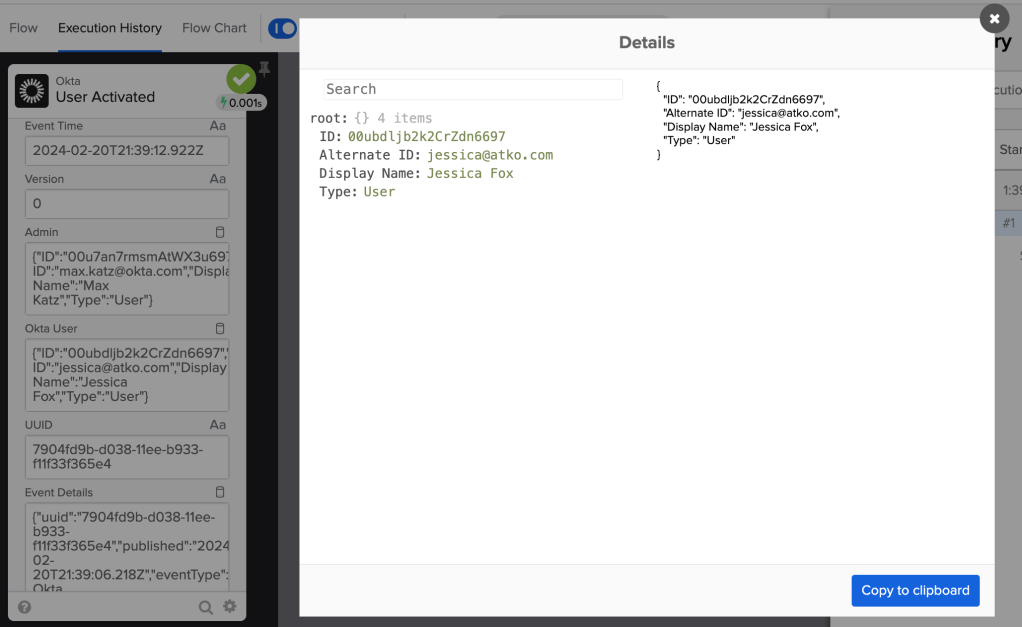 - To test with the user ID, copy it from the Execution History page. Copy the ID from the Okta User field in the User Activated card.