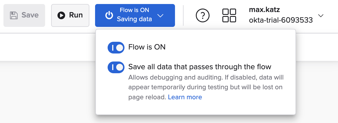 - Also, check the Save all data that passes through the Flow? checkbox. You will be using this capability at the end of this tutorial.