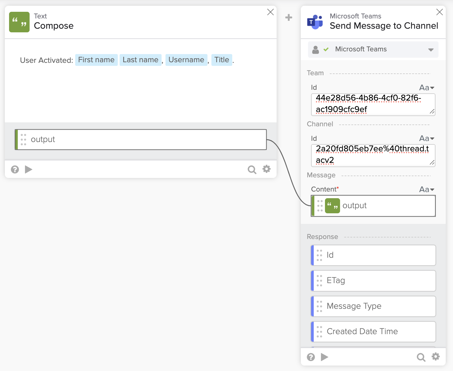 - Connect the output field from the Compose card to the Message Content field on the Send Message to Channel card.