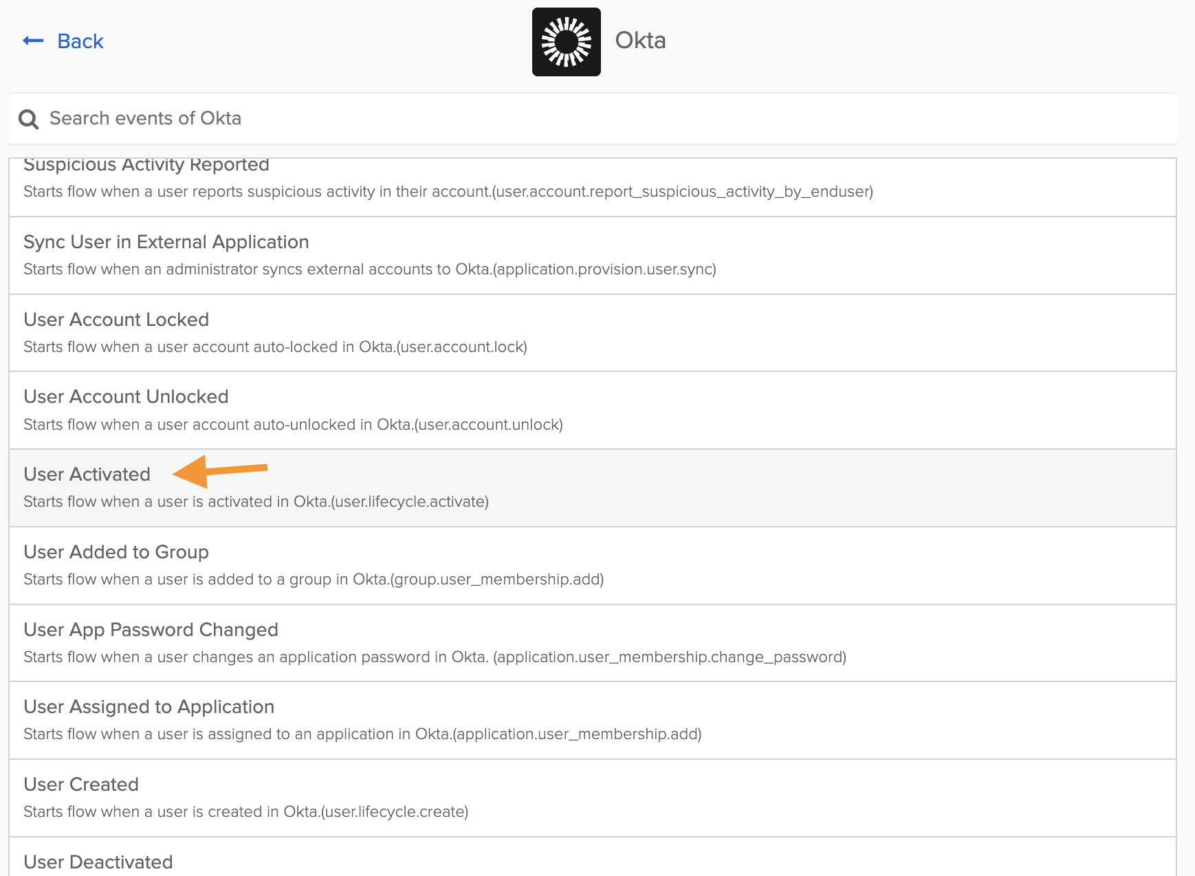 You want to send a notification when a user is activated in Okta. You need to trigger the flow on the user-created event in Okta.
