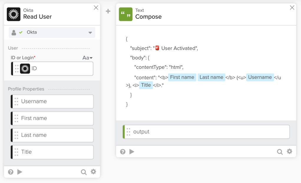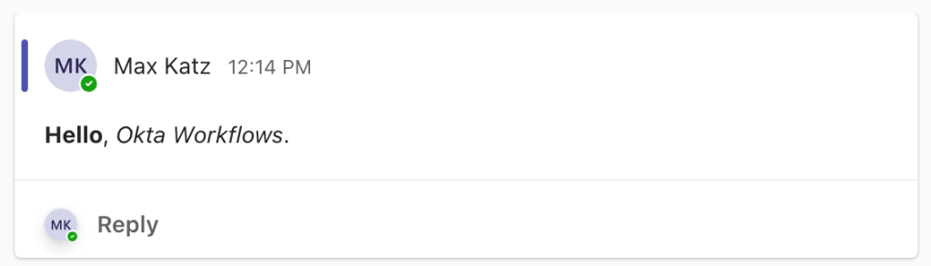 "content": "<b>Hello</b>, <i>Okta Workflows</i>."