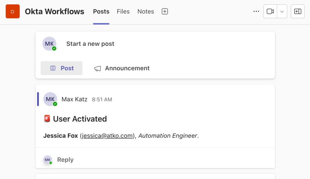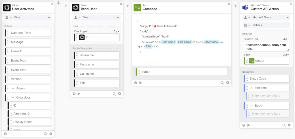 | Send an Email Notification for a New Okta Event Send a Notification to Microsoft Teams for a New Okta Event Send a Rich Message to Microsoft Teams for a New Okta Event Using Microsoft API |