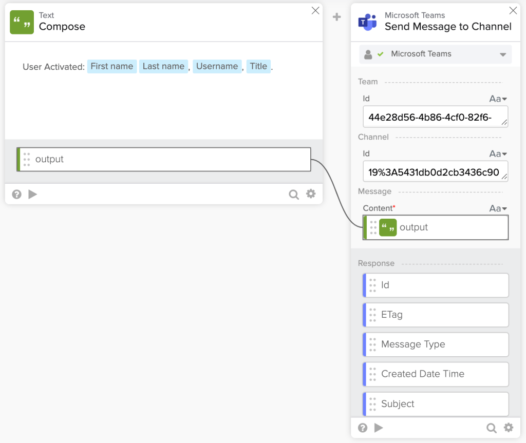 - Pass the fields from the Read User card to the new Compose card’s message: