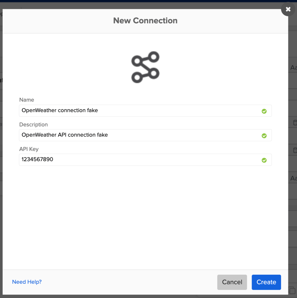 - Enter The OpenWeather connector provides weather information. for the Connection description.