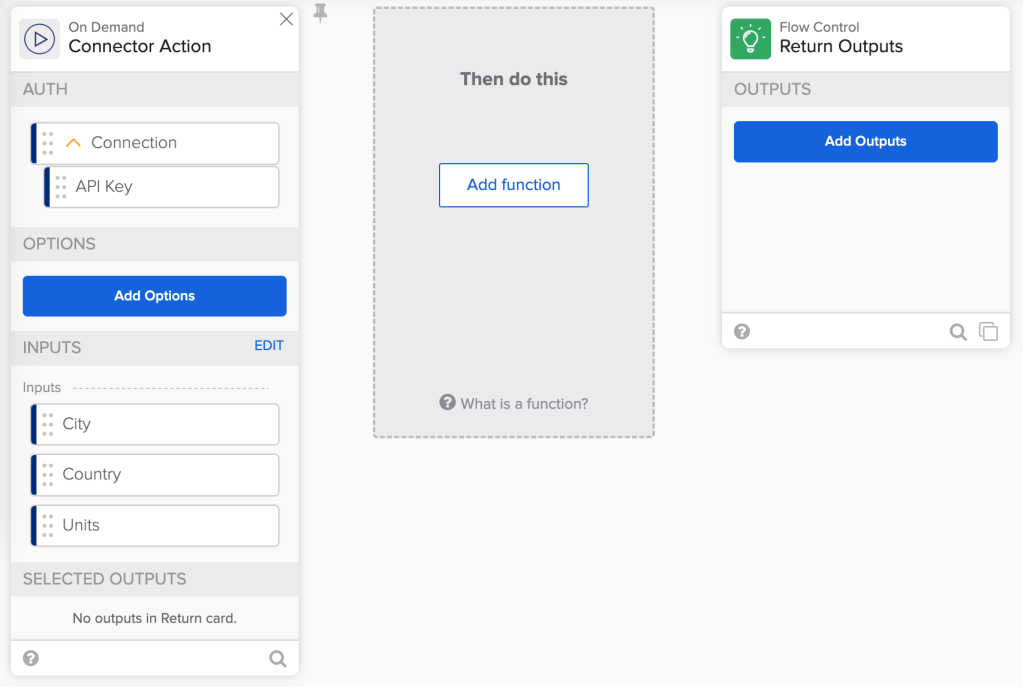 - Custom API action: an action to call any API endpoint from OpenWeather API.