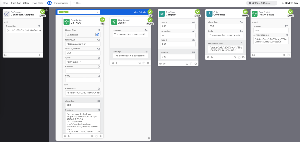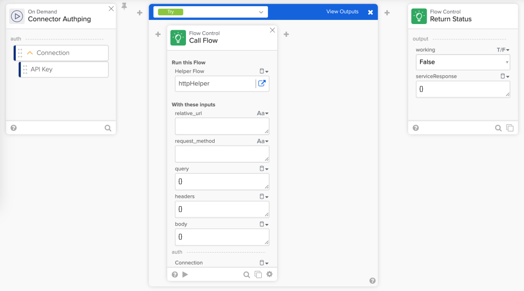 The httpHelper is a system flow that manages authentication and HTTP requests for the connector. The httpHelper flow is a helper flow; other flows can call it. The flow has: