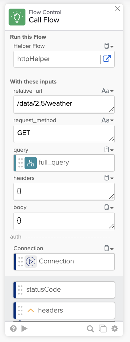 The httpHelper is a system flow that manages authentication and HTTP requests for the connector. The httpHelper flow is a helper flow; other flows can call it. The flow has: