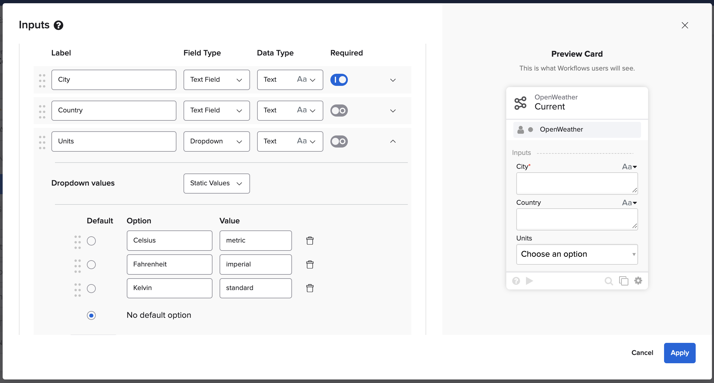 - Enter a City, Country and choose Units on the Weather – Current card.