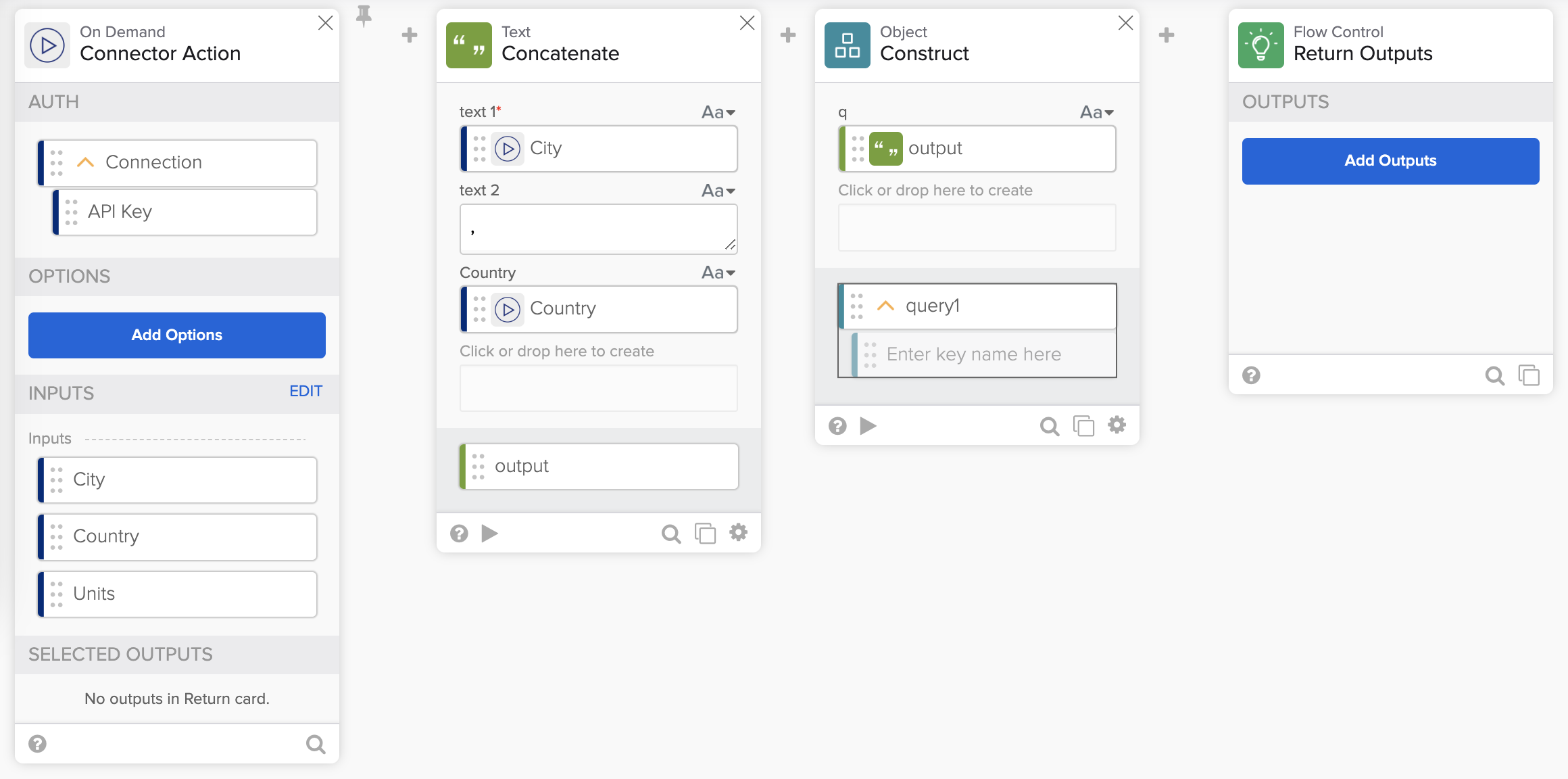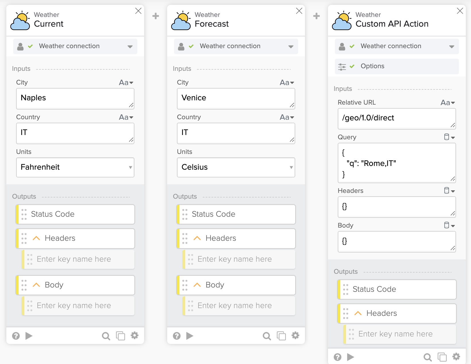 - Custom API action: an action to call any API endpoint from OpenWeather API.