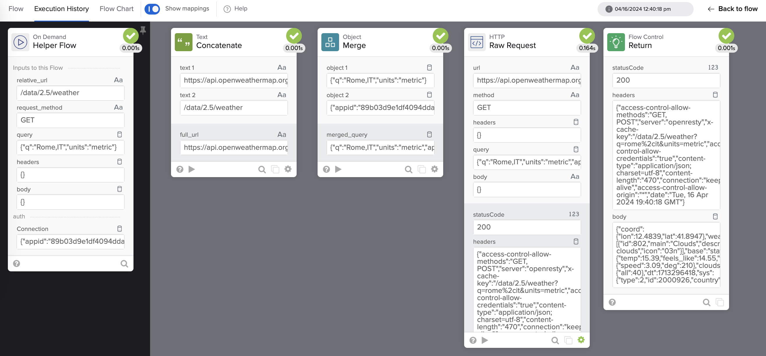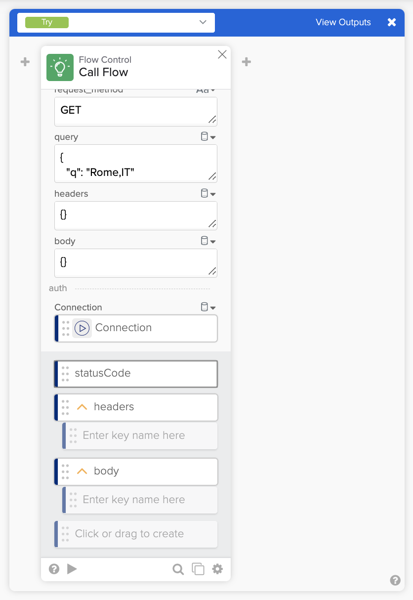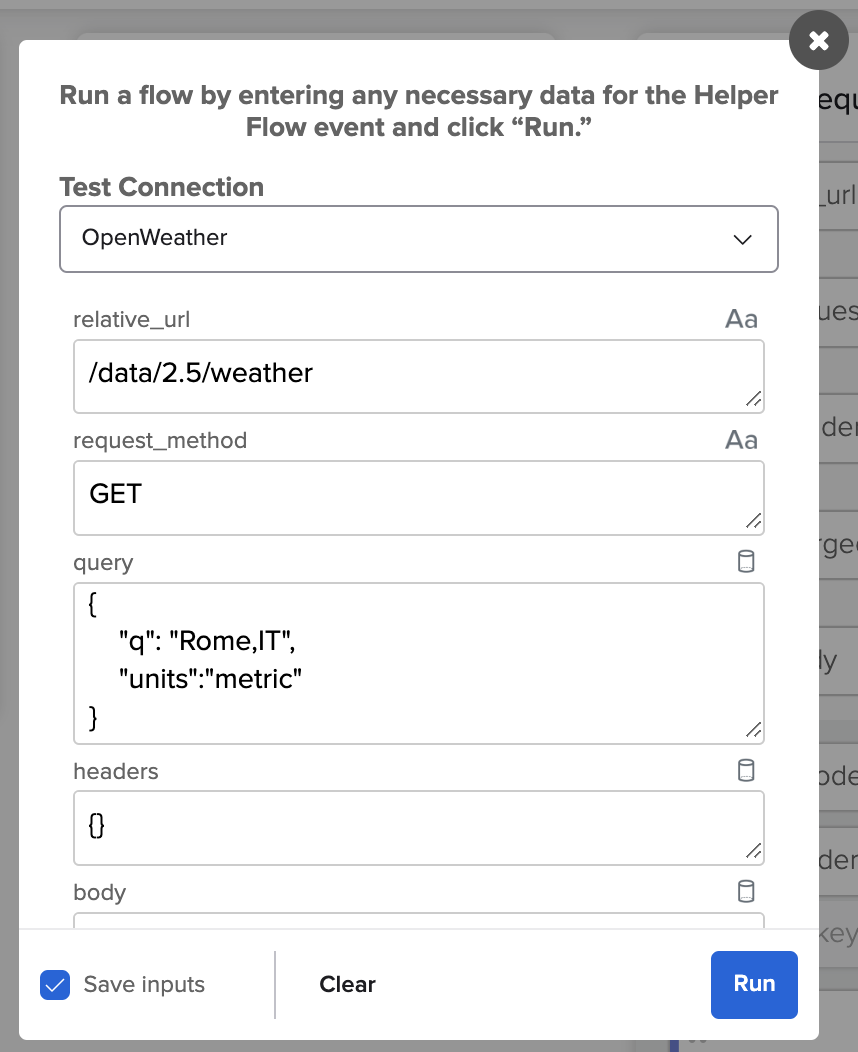 {"q": "Rome,IT"}for the query field. - Click Run to test the flow.