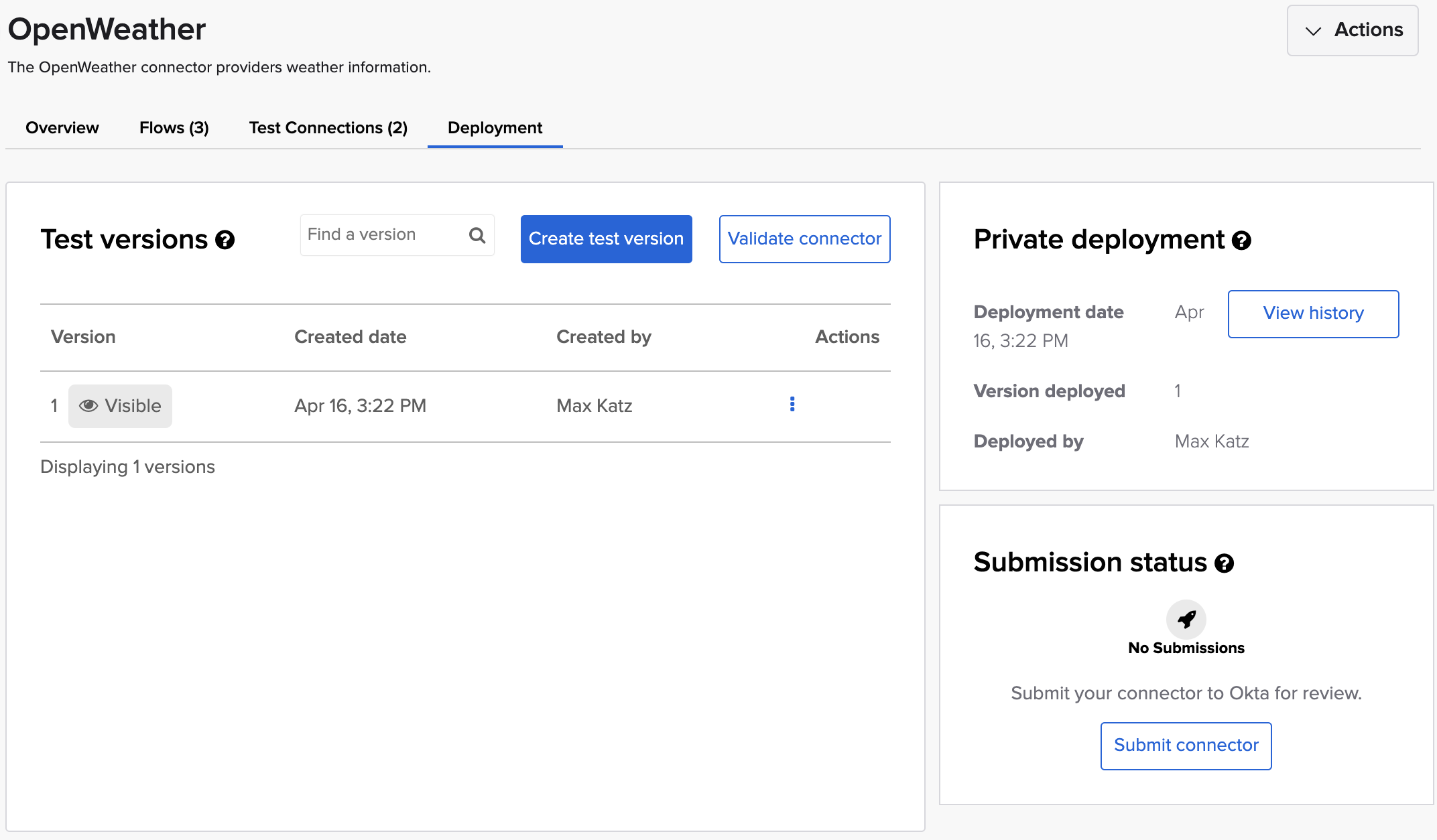 You built a connector with three actions for the OpenWeather API in the Okta Workflows Connector Builder.