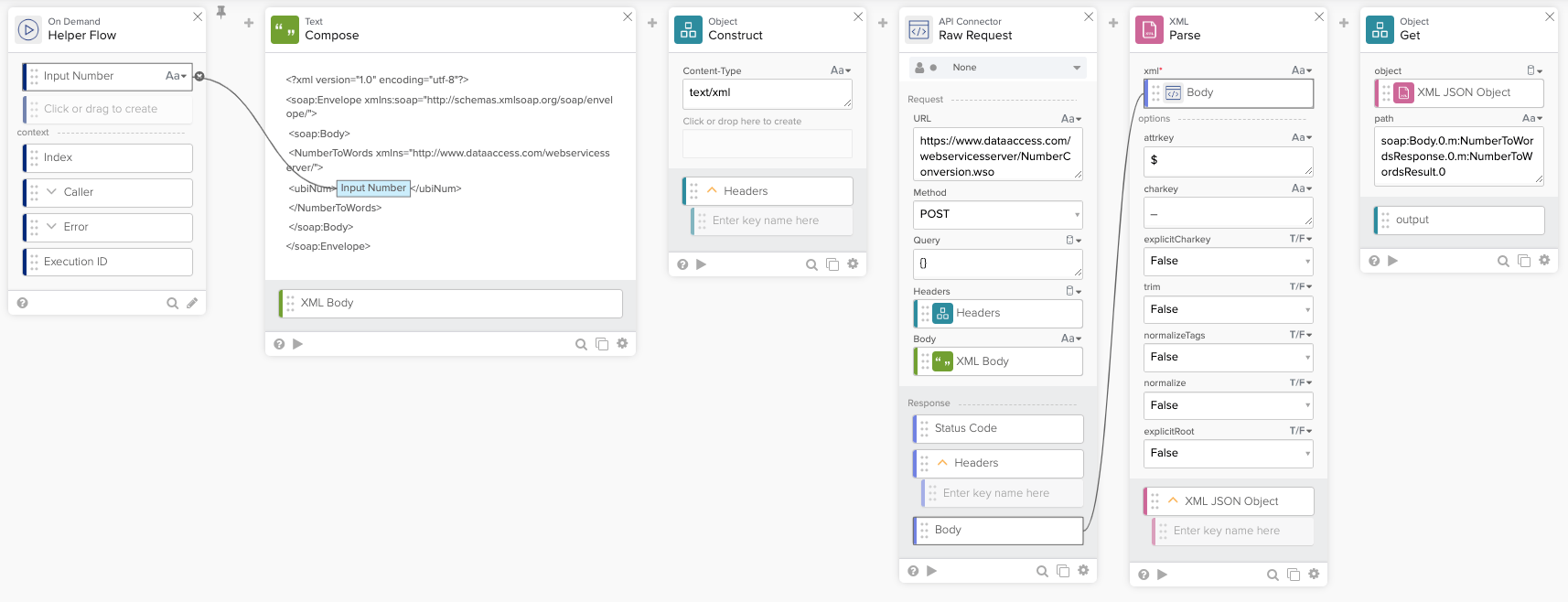 In the last step, the Object – Get card gets the result using the soap:Body.0.m:NumberToWordsResponse.0.m:NumberToWordsResult.0 key.