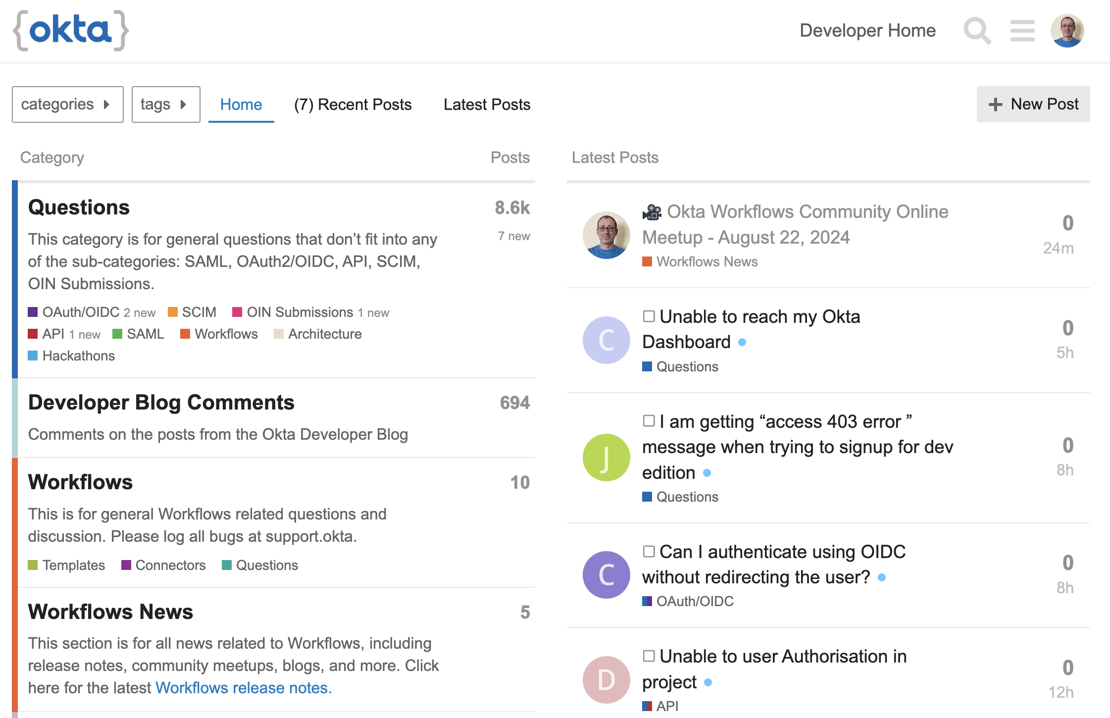 The Okta Workflows forum is part of the Okta Developer forum. Workflows has two categories: