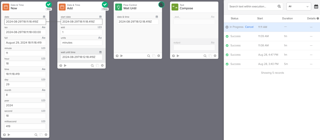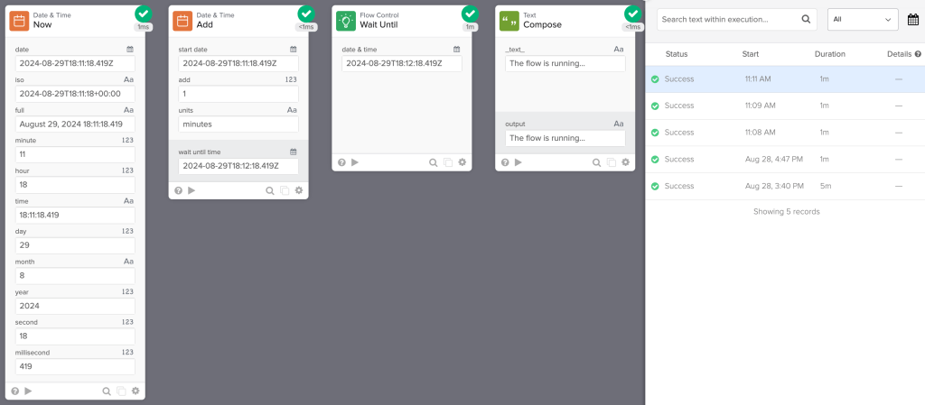 When you run the flow, it will pause for one minute. You can configure a longer period.