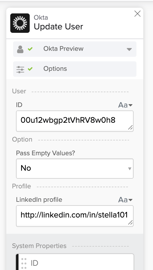 Use the Okta—Update User card to update a custom user profile attribute. This screenshot shows how to update the custom LinkedIn profile field.