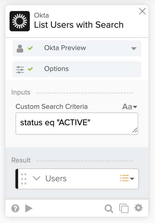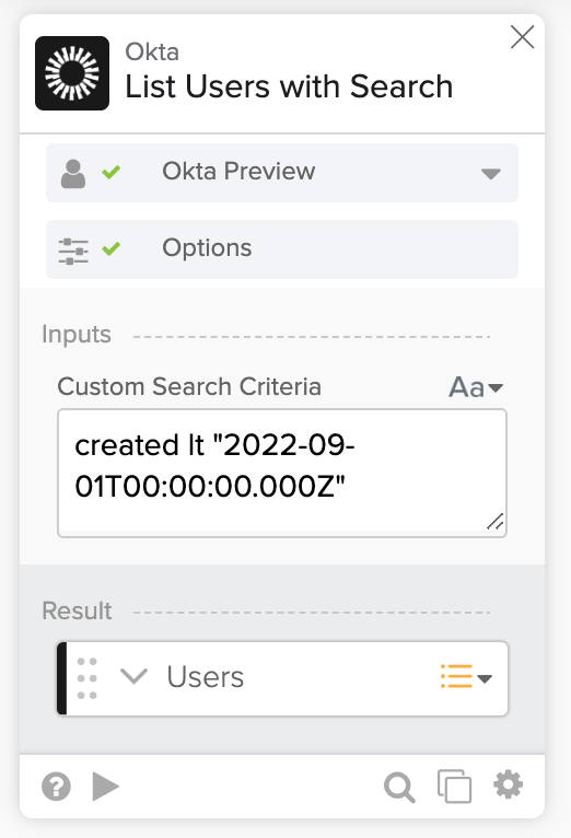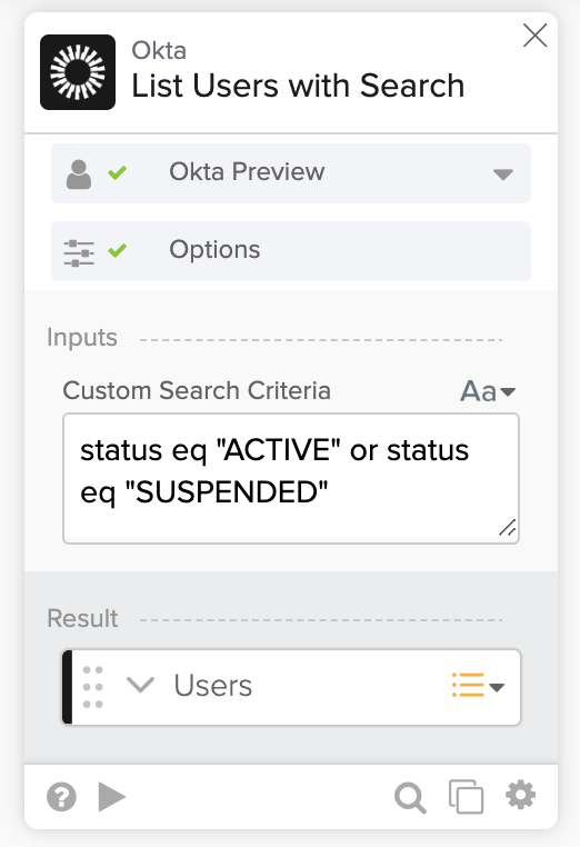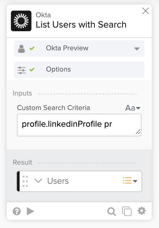 The Custom Search Criteria field uses the List all Users API search parameter.(There is also a filter parameter, and the Okta – List Users with Filter card uses it)