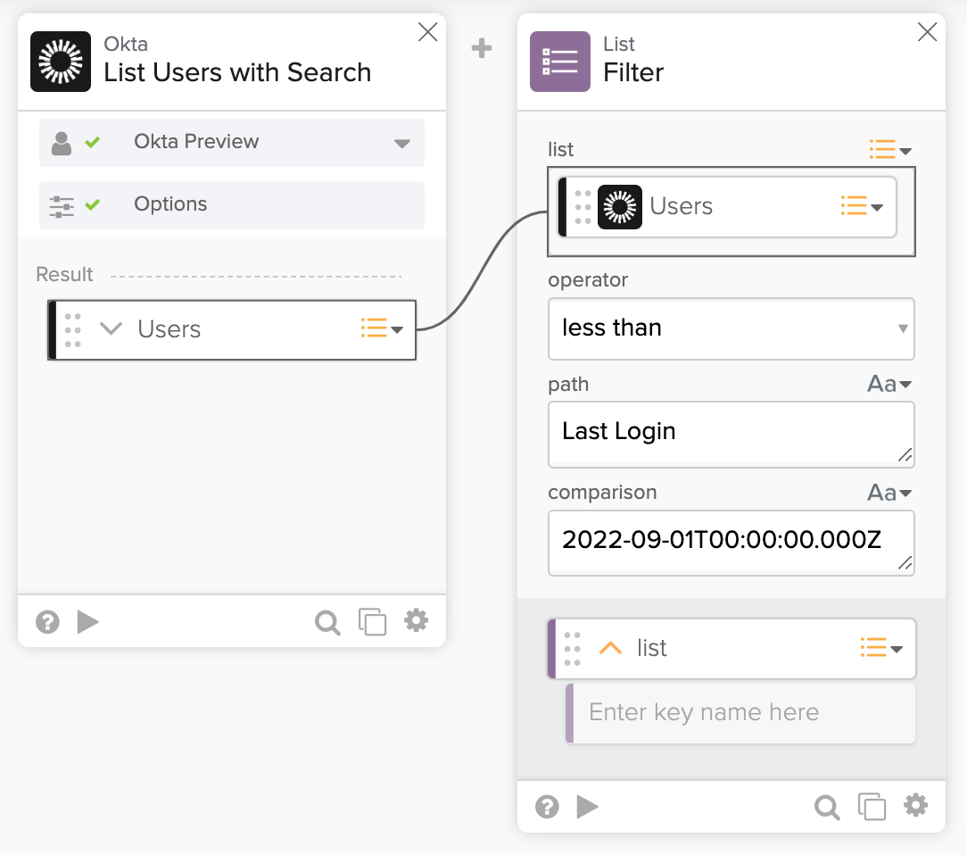 The List Users with Search card returns all users. The card passes the user list to the List—Filter card, which filters the list for users whose last login was before a specified date.