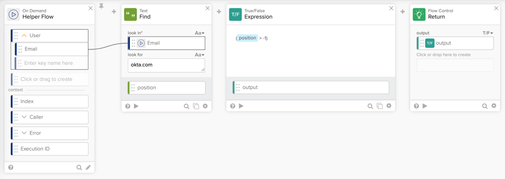 The True/False – Expression card checks if a text is contained within another string. If the email ends with okta.com, the Expression card returns true. Otherwise, it returns false.