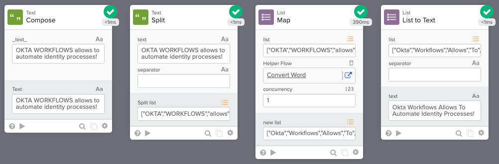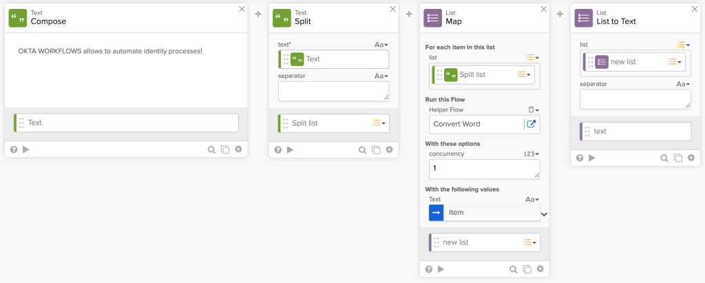 The List – Map card uses a helper flow to format each word from the list. The card returns a new list with all the words in the correct format.