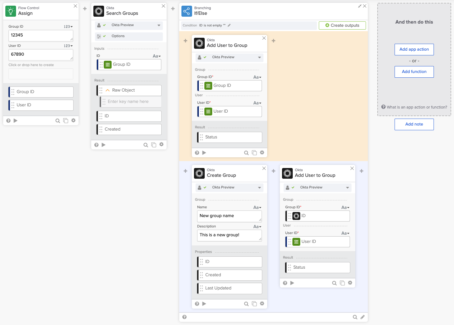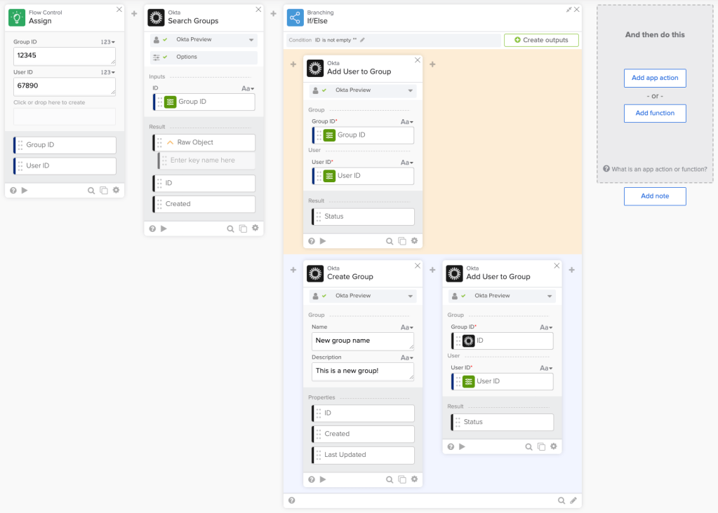 How do you build the following flow? Check if a group exits. If yes, add a user to the group. If the group doesn’t exist, create it and add the user to it.