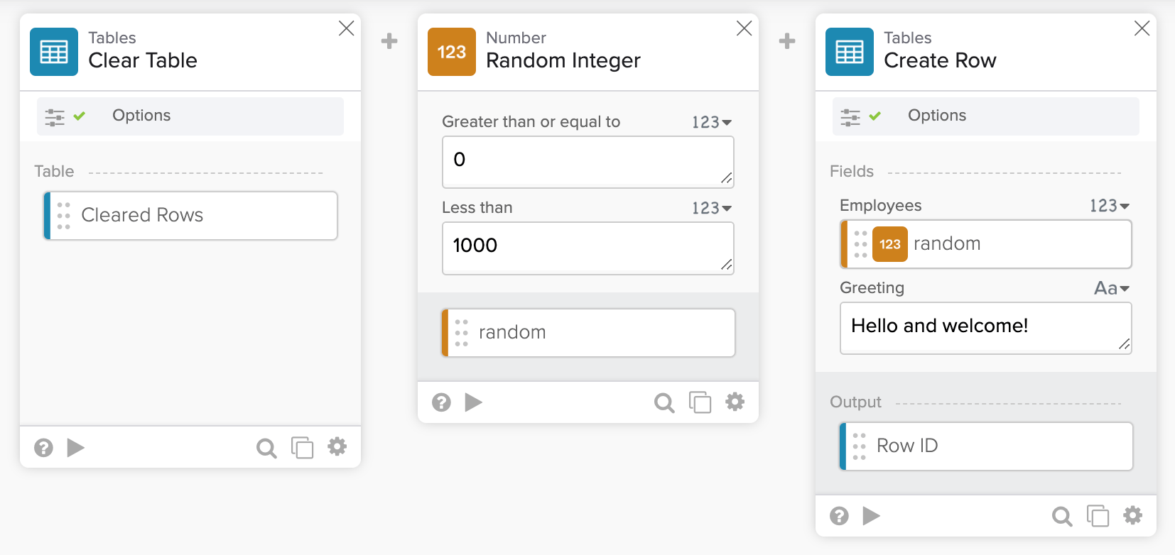 The flow above saves a random number between 0 and 1000 for Employees and a text message for Greeting into a table.