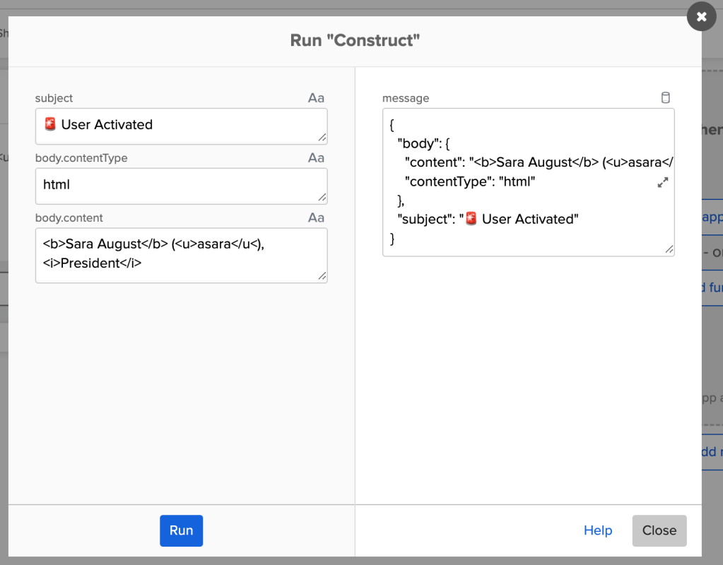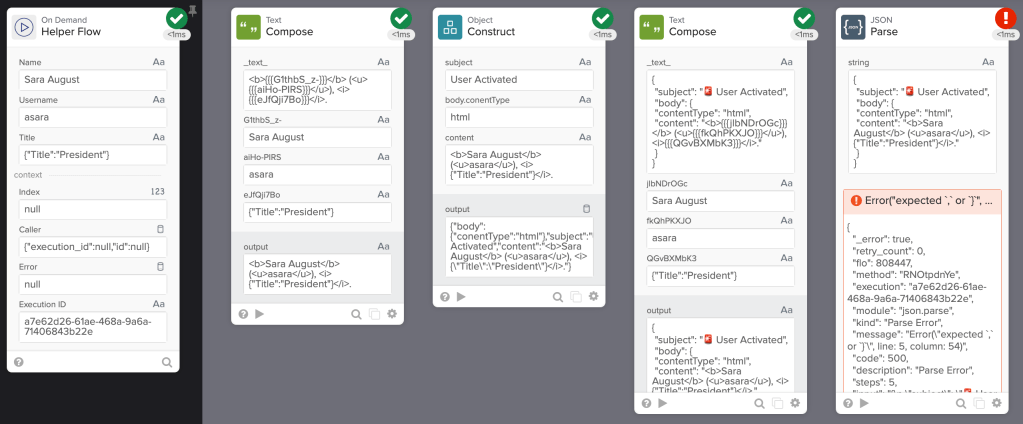 The next run shows entering {“Title”:”President”} for the Title input. The ObjectâConstruct card creates a valid JSON, while the Text – Compose card doesn’t create a valid JSON.