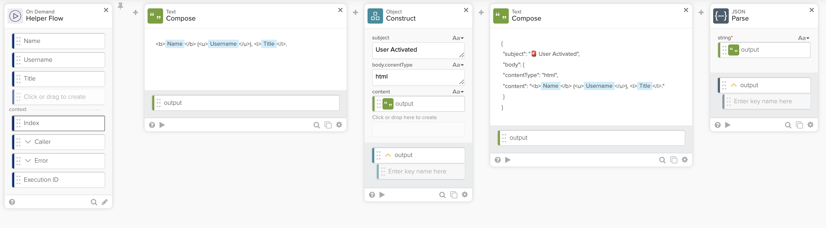 The following flow uses ObjectâConstruct and TextâCompose cards to create a JSON object. At the end, the JSONâParse card validates the JSON from the Compose card.