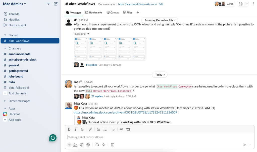 The Okta Workflows community on the Mac Admins Slack is vibrant and active. People love helping each other. Join the #okta-workflows channel.