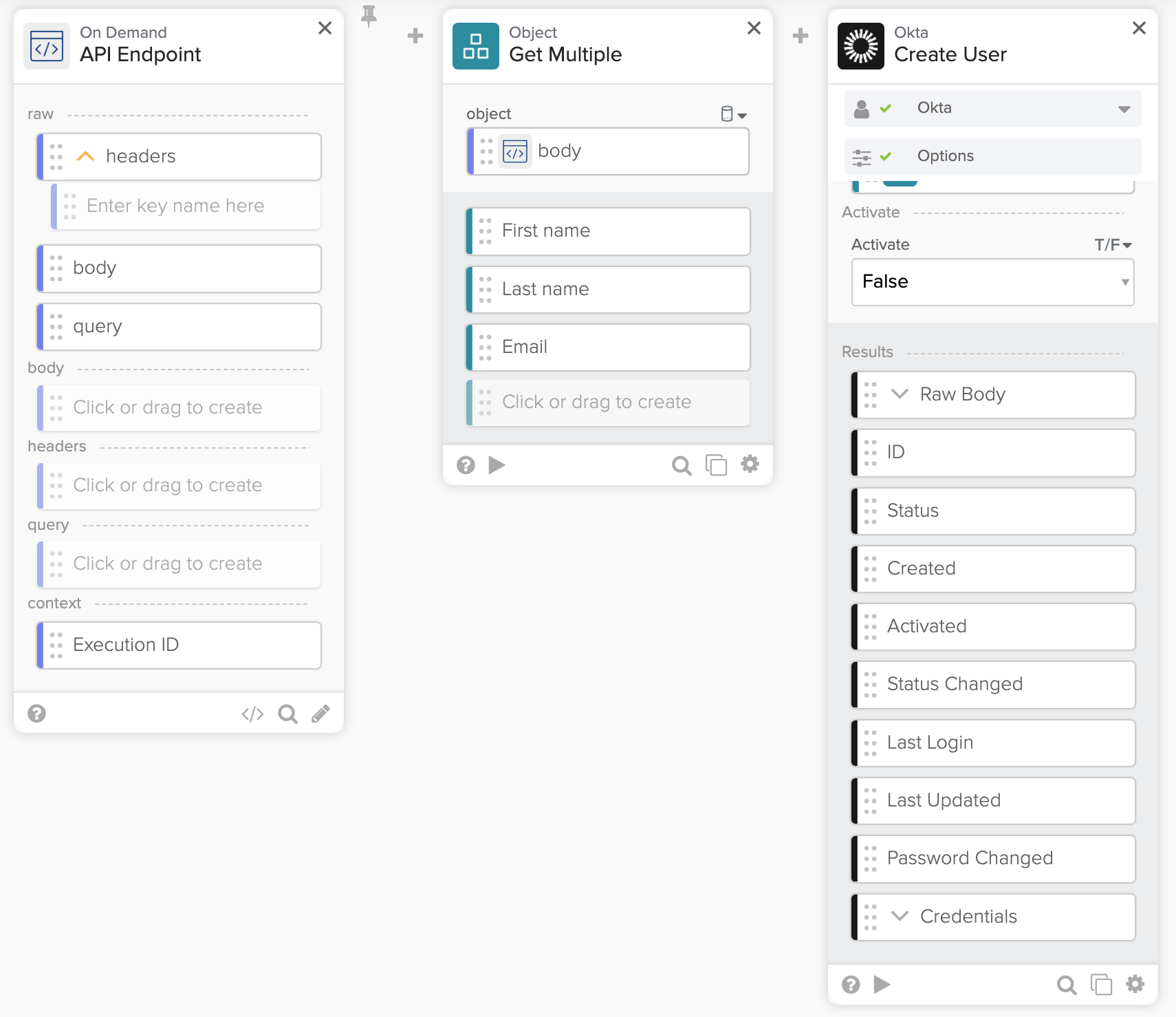 - The first card is the Okta – User Activated event. It sets up the flow to trigger when a user is activated in Okta.