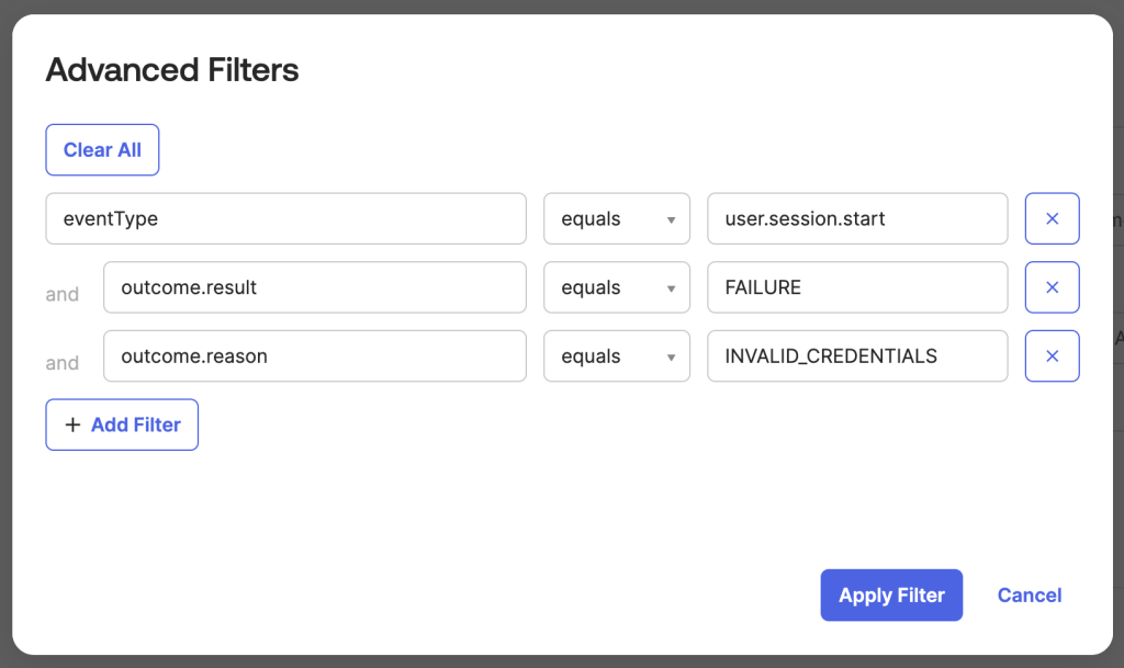 When searching the System Log, we advise creating a query in the Okta dashboard and then using the query with a Workflows card.