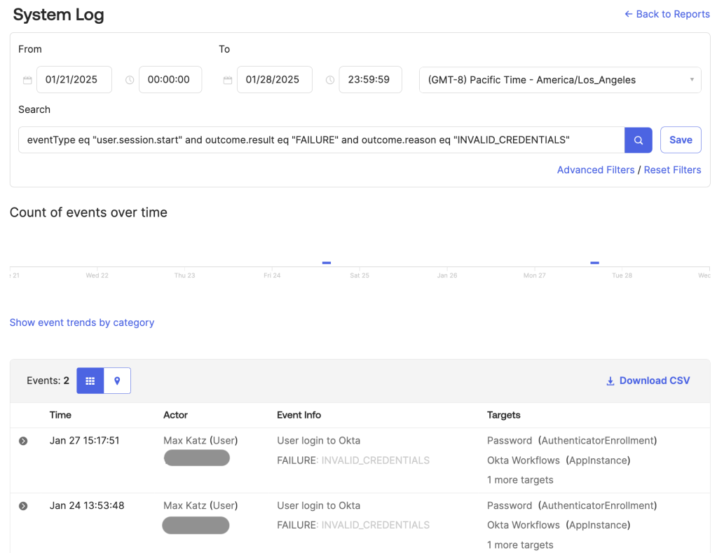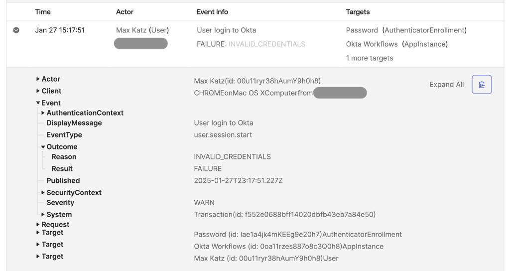 Find one event in the System Log to help build the query above. Expand the event keys, such as Event and Outcome, to help find the necessary values and create the query. Also, click the copy icon next to Expand All to copy the entire event JSON.
