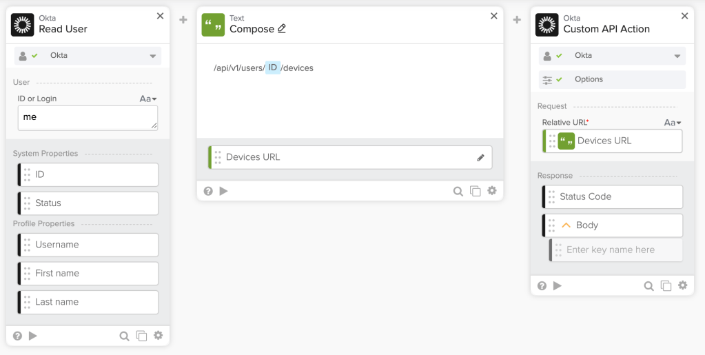 - The Okta—Custom API Action card calls the List all devices endpoint and returns a list of devices for the user.