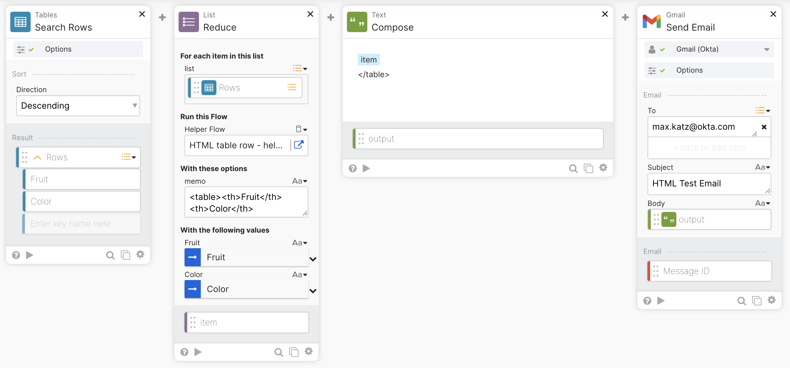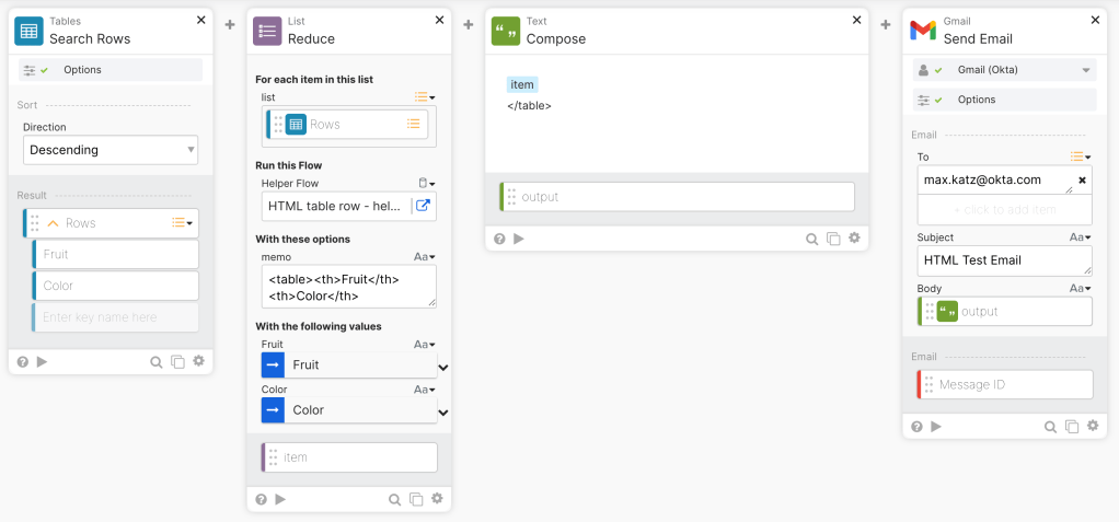 This guide will teach you how to send an HTML email with data from a table in Okta Workflows.