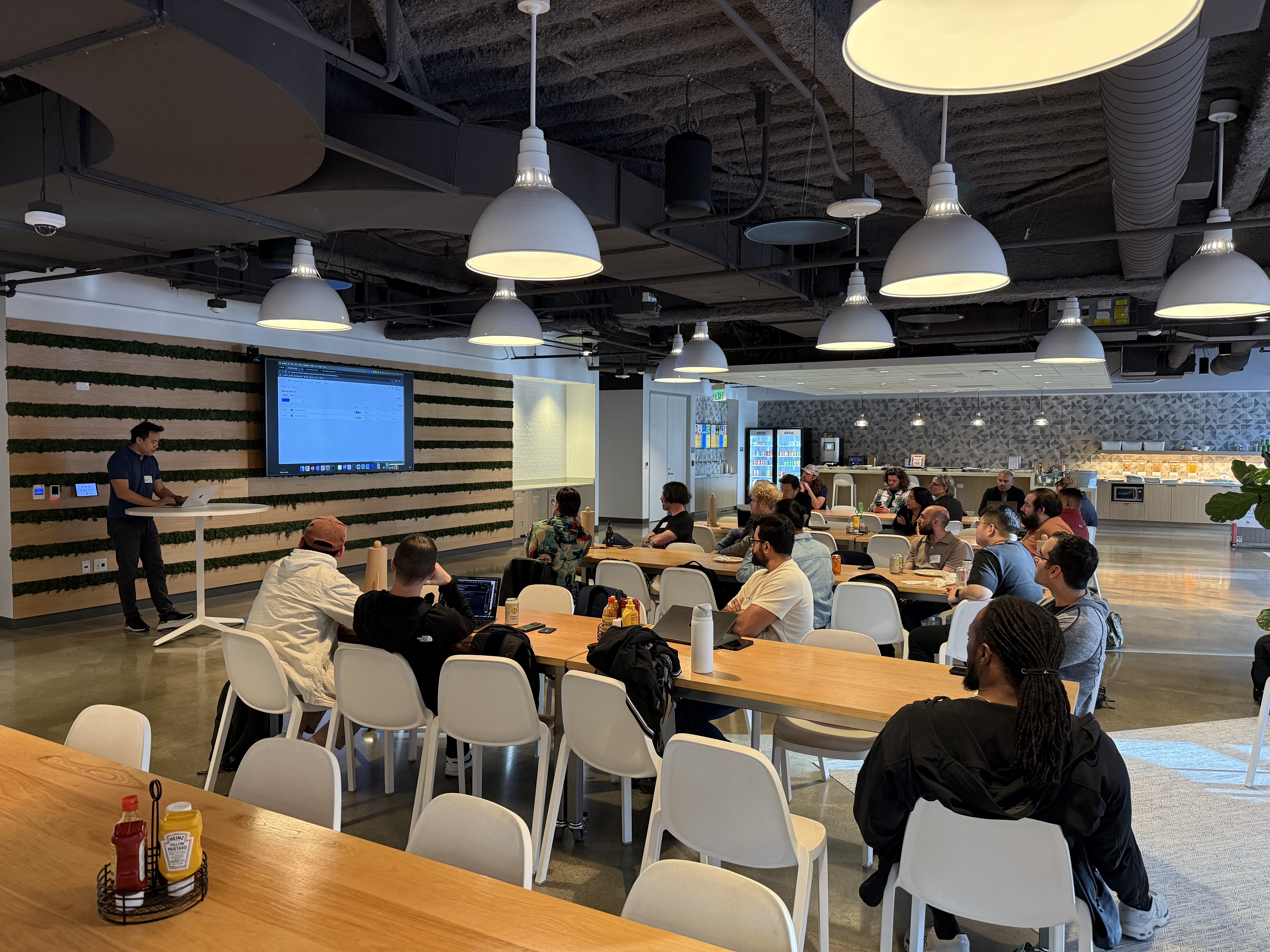 We hosted an in-person Okta Workflows community meetup at Okta headquarters on May 7, 2025. Over 30 Workflows community members learned about what’s new in Workflows, chatted with other community members, and enjoyed delicious Mediterranean food.