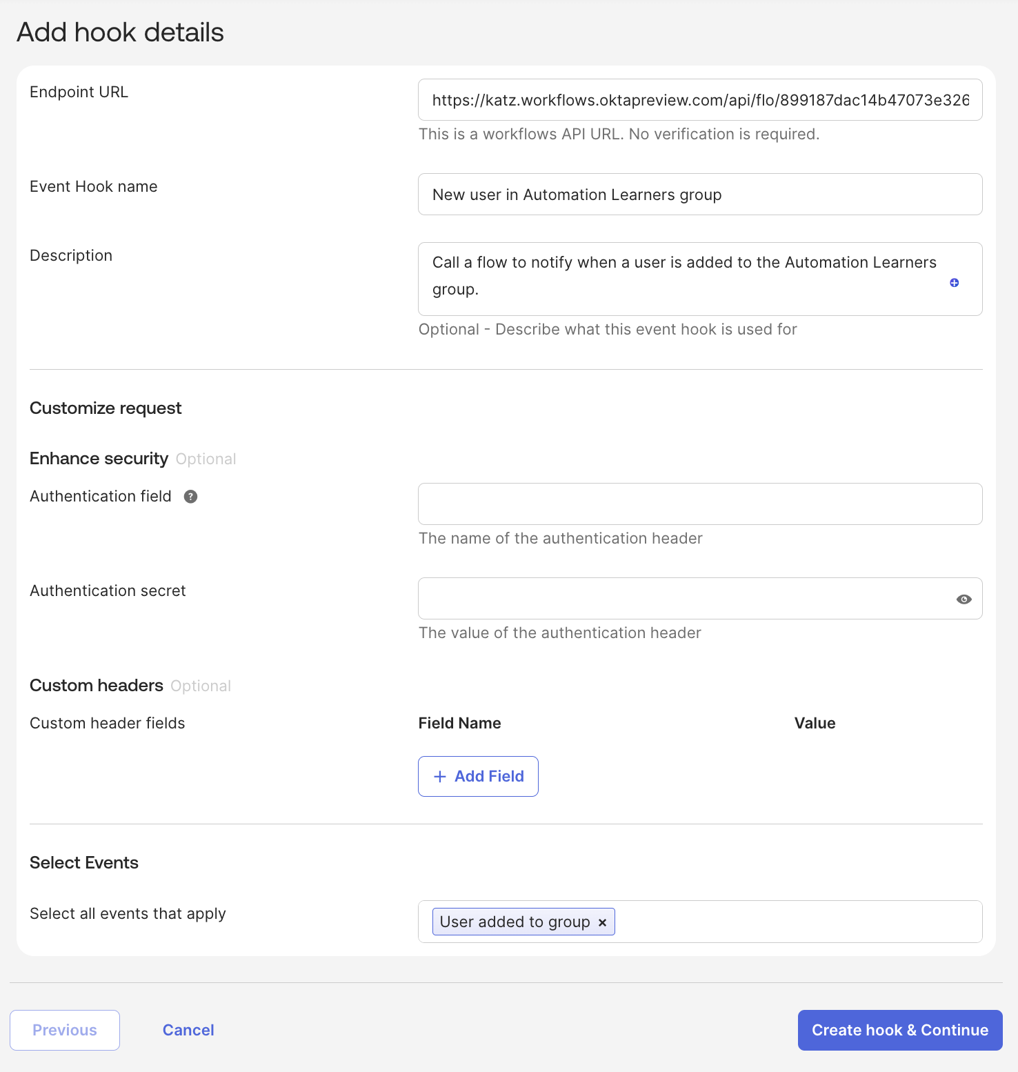 An Okta event hook works like a webhook. The event hook allows it to call an API endpoint when an event occurs. You can invoke a Workflows flow via an API endpoint. You will use the Invoke a flow with an API endpoint capability to run a flow when an event occurs in Okta.