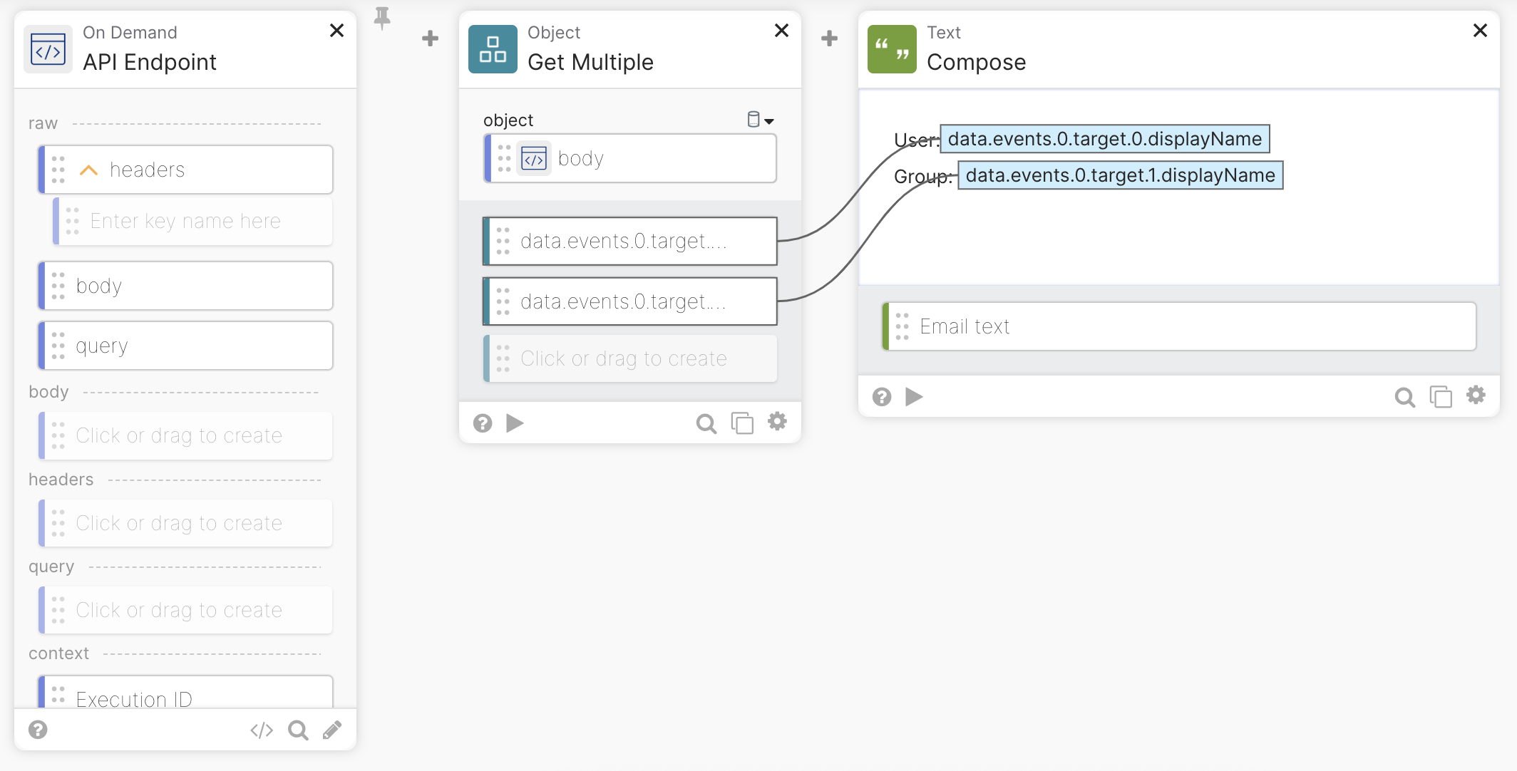 The API Endpoint card’s body field contains information about the user and group. To use that information, you must first extract it, create a message, and send an email.