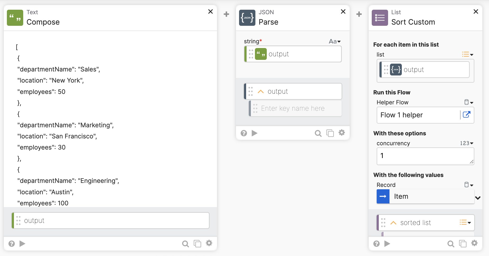 - The List-Sort Custom card calls a helper flow for a custom sort.