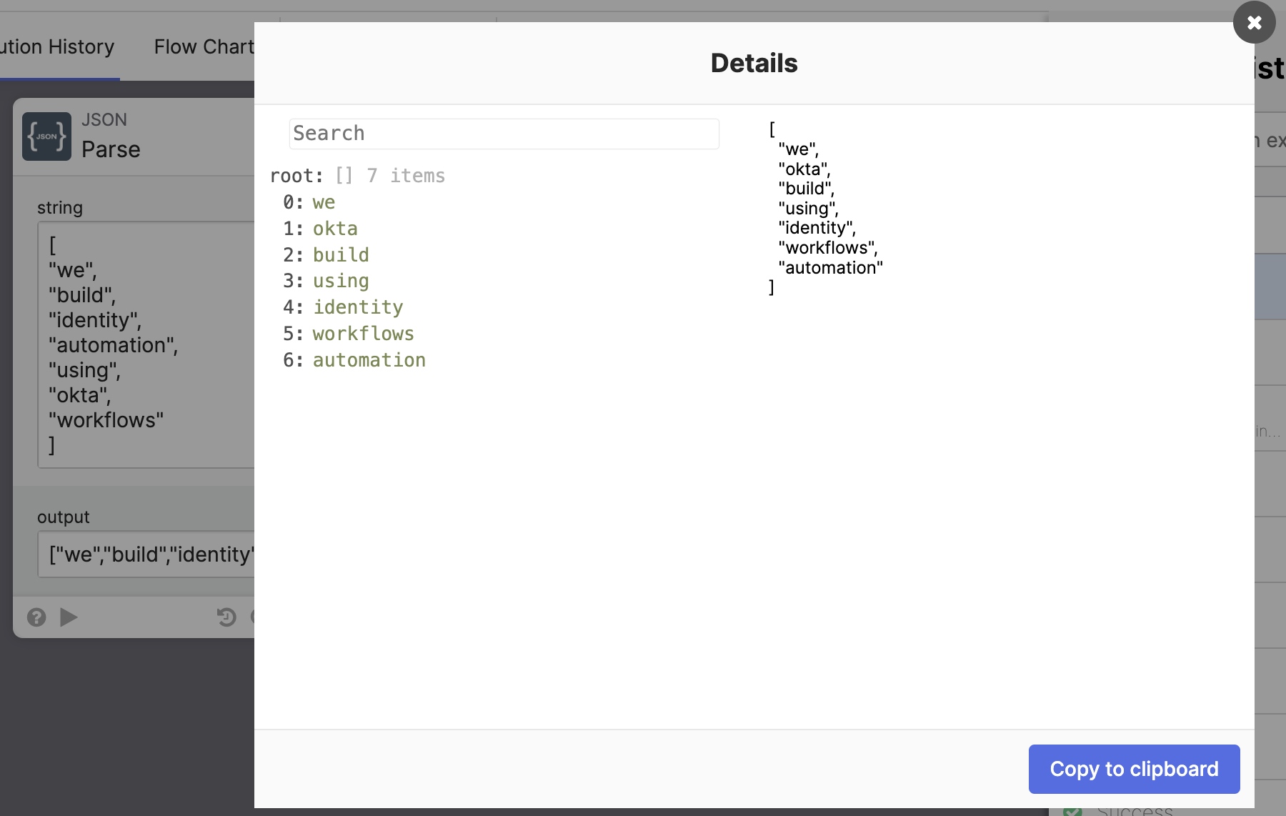 Running the flow will sort the list using each word’s length. The original list order is also visible in the JSON-Parse card.
