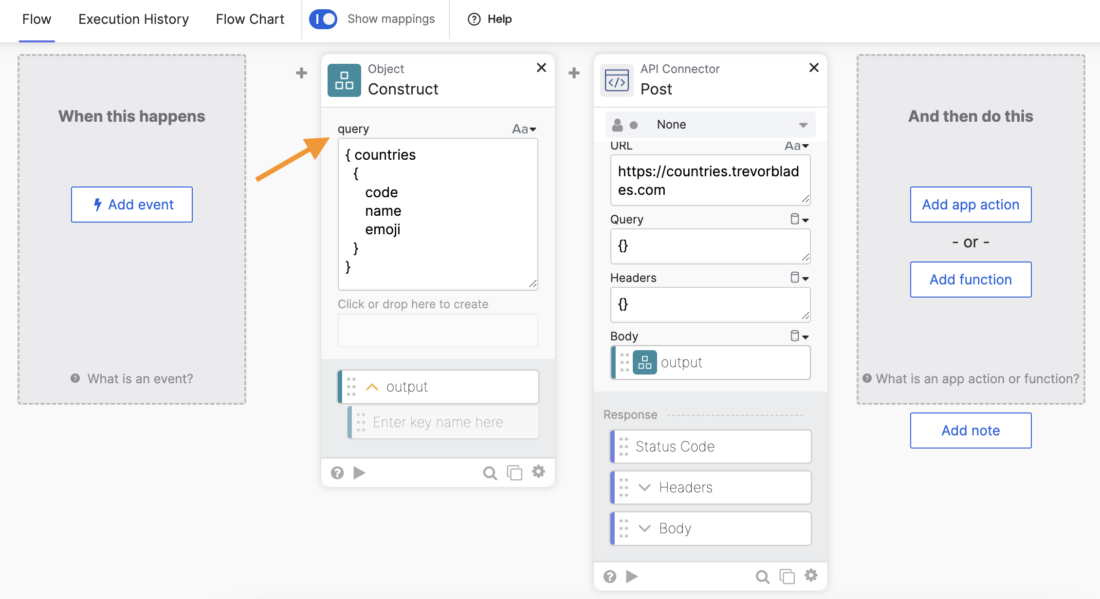 The flow will use this Countries GraphQL endpoint example from Postman. The API endpoint is at https://countries.trevorblades.com.