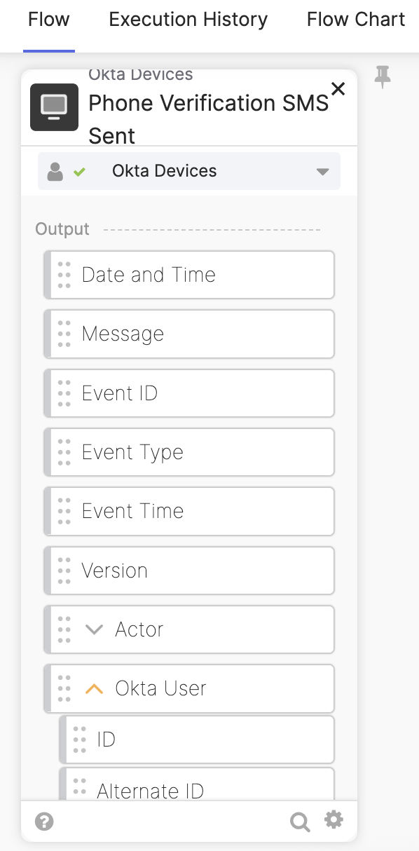 Use the Okta Devices connector-Phone Verification SMS event card to trigger a flow when a user uses the SMS factor.
