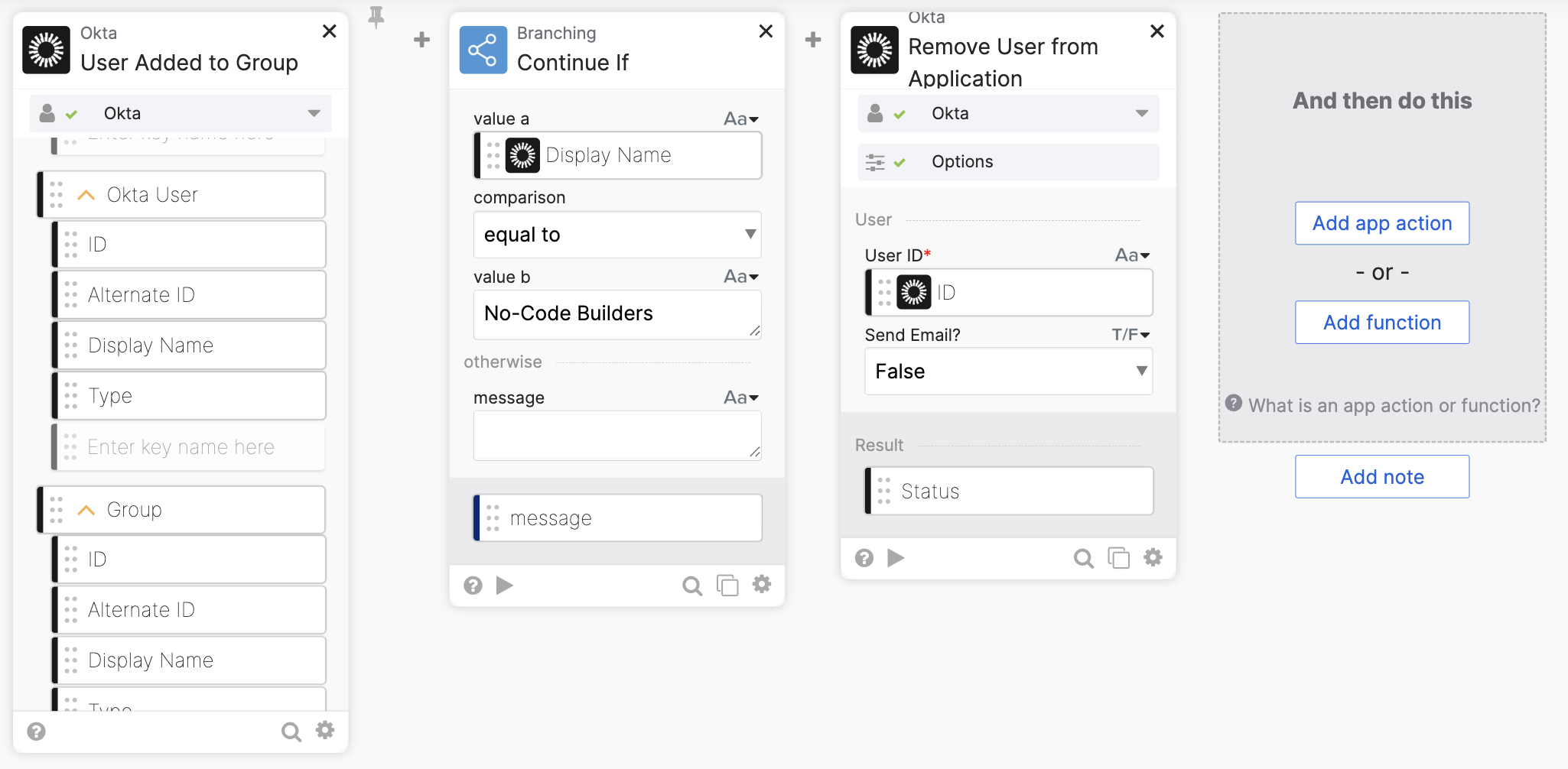 This guide teaches how to remove a user from an app when the user is assigned to a group in Okta Workflows.