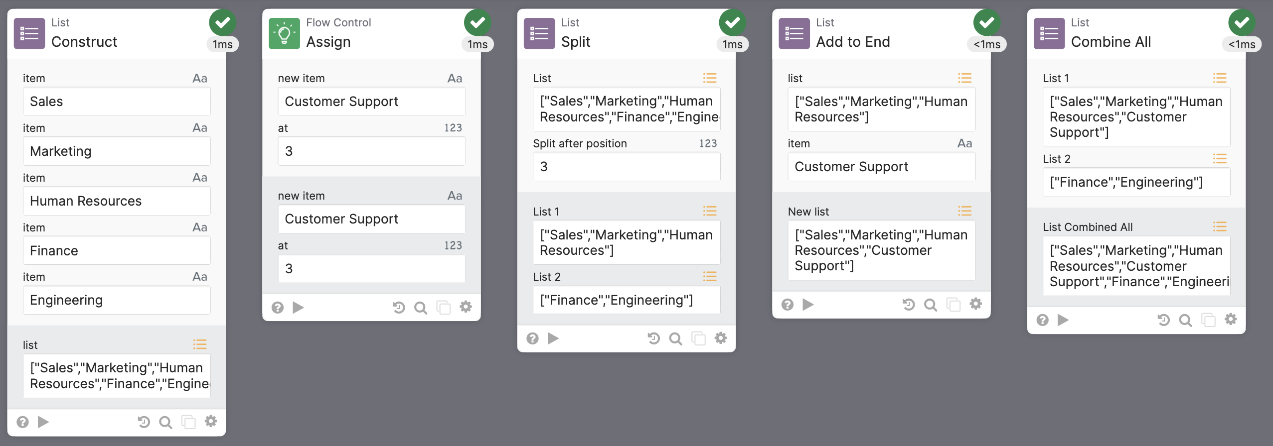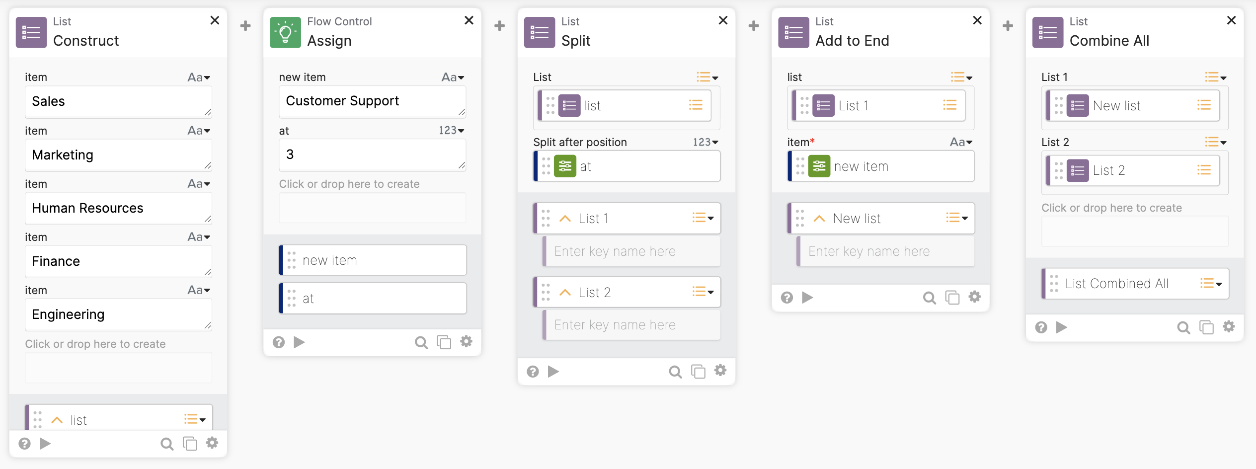- The Flow Control-Assign card creates an item to insert into the list and at what position (index).