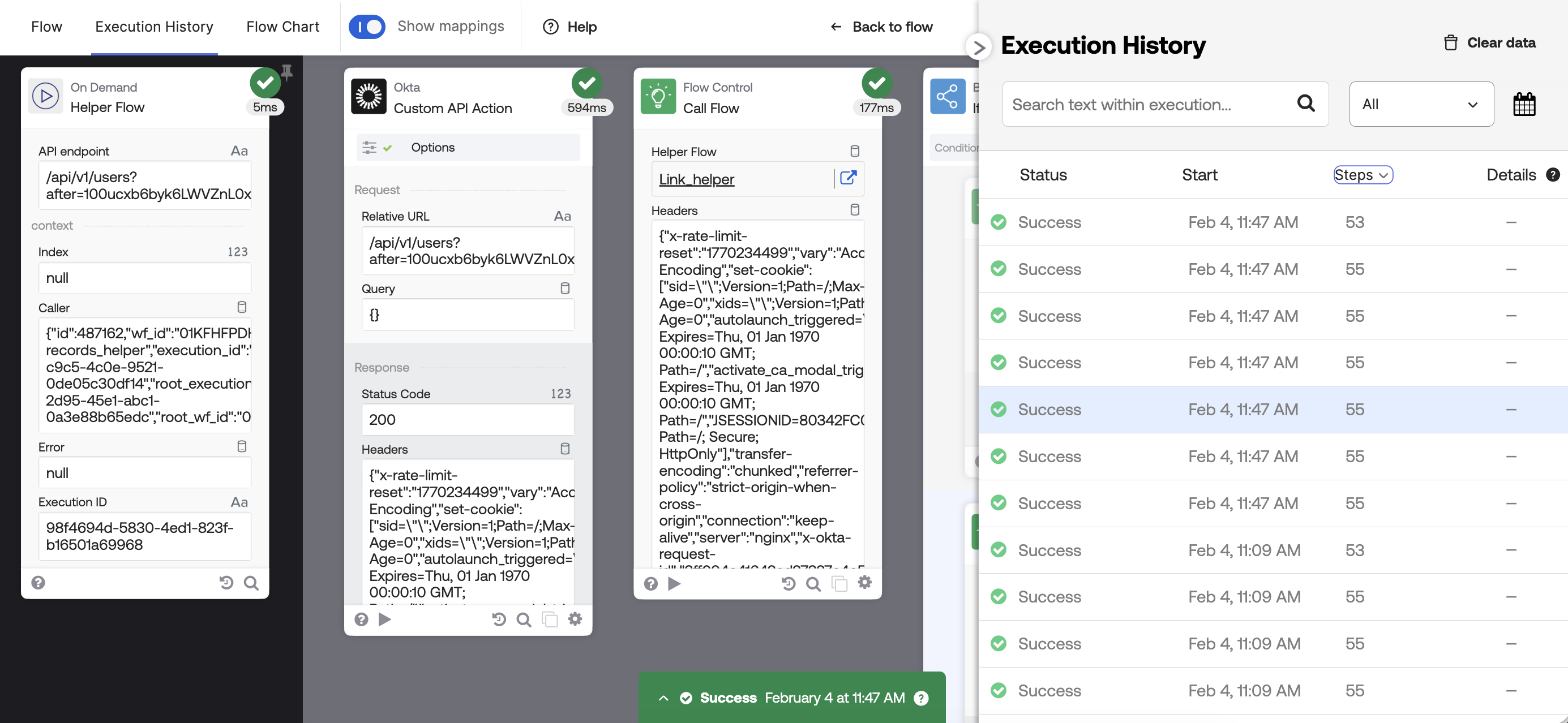 - Steps: The total count of steps the flow took to execute. Open the History Inspector view (the green panel inside the flow) to see the count for each card.