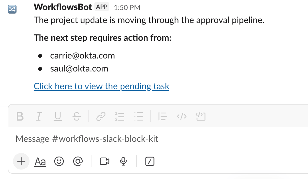 [ { "type": "rich_text", "elements": [ { "type": "rich_text_section", "elements": [ { "type": "text", "text": "The project update is moving through the approval pipeline.\n\n" }, { "type": "text", "text": "The next step requires action from:", "style": { "bold": true } }, { "type": "text", "text": "\n\n" } ] }, { "type": "rich_text_list", "style": "bullet", "indent": 0, "border": 0, "elements": [ { "type": "rich_text_section", "elements": [ { "type": "text", "text": "mona@okta.com" } ] }, { "type": "rich_text_section", "elements": [ { "type": "text", "text": "todd@okta.com" } ] } ] }, { "type": "rich_text_section", "elements": [ { "type": "text", "text": "\n" }, { "type": "link", "url": "https://example.com/tasks/12345", "text": "Click here to view the pending task." } ] } ] }]